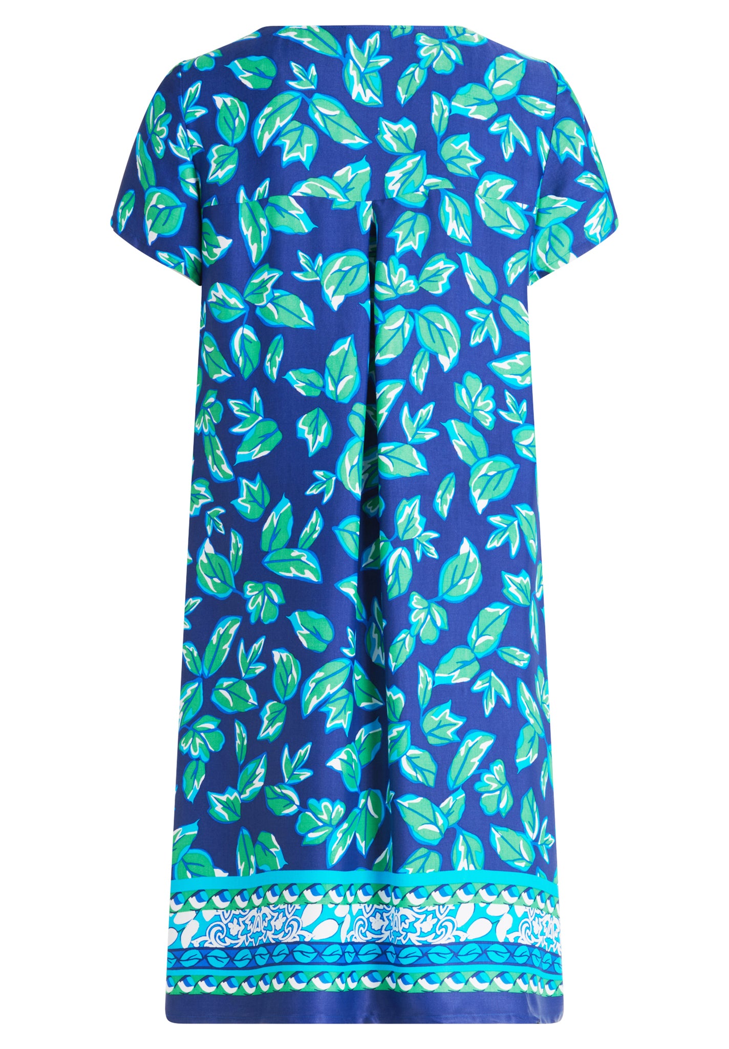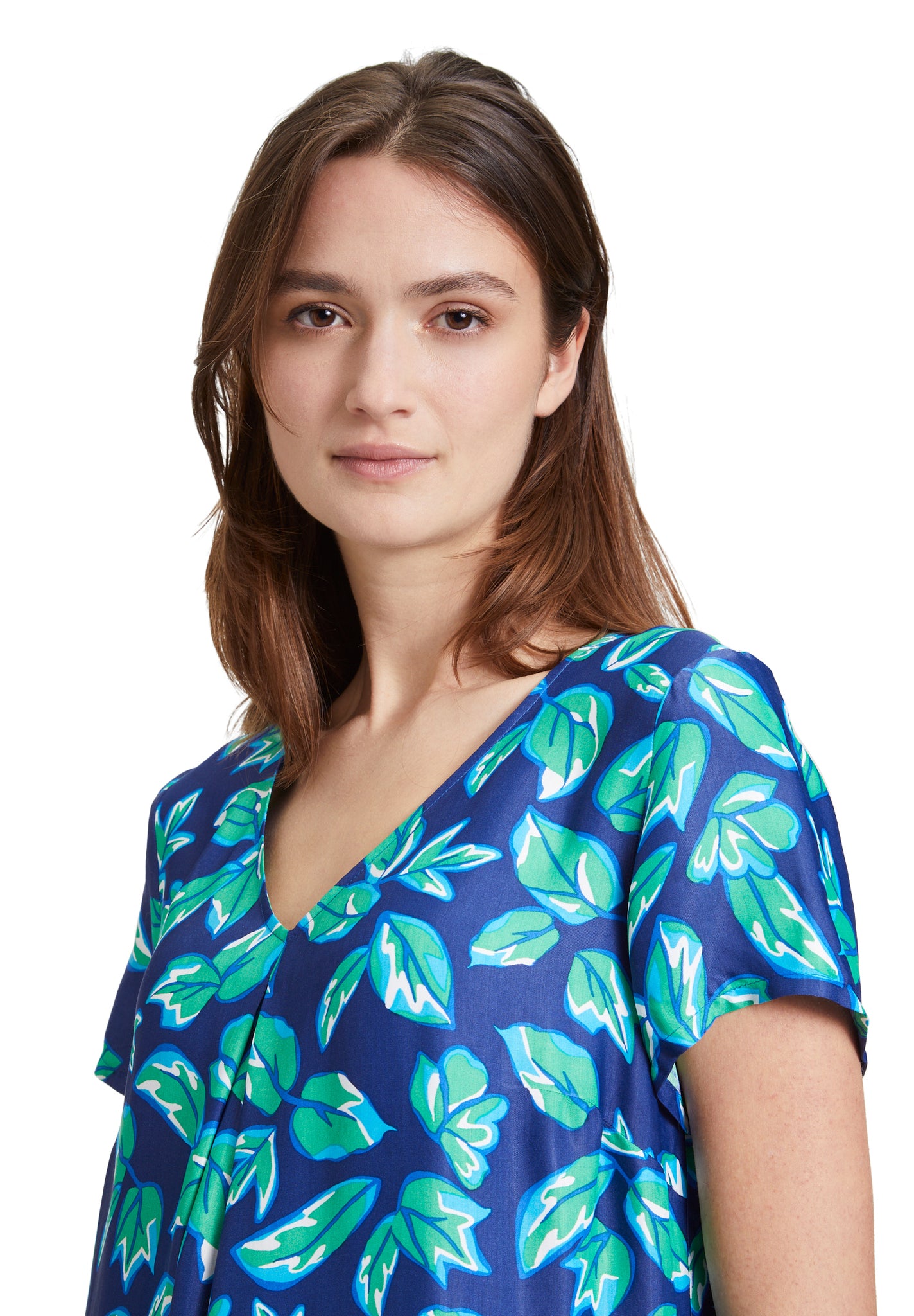 Beautiful viscose dress from Betty Barclay. Turquoise-green leaves on a cornflower blue background. This is a great easy to wear piece, short-sleeved, straight-cut, v-neck with sewn seam that gives the dress a nice fall, fit is a normal size.