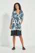 It’s printed with abstract leaves that look like they’ve been painted on and is shaped with a V-neck and short sleeves that gather towards buttoned cuffs. Side slits at the hem encourage flouncy movement of the airy fabric as you walk.