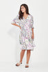 The Illusion Dress is crafted in soft-touch rayon and features an exclusive Verge print, offering both comfort and visual impact. A flattering V-neckline is framed by ladder lace inserts across the shoulders for a touch of delicate detail. The bodice is shaped with an empire seam and gentle gathers to create a relaxed, feminine silhouette. Elbow-length puff sleeves finish with shirred elastic cuffs and a soft frill, adding volume without bulk.