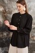 Glide by Verge - Tumbled satin shirt with Mandarin collar and front button placket. Back yoke. The bracelet sleeve has soft gathers at the shoulder and button cuff. The Seattle shirt falls below the hip with a curved hemline