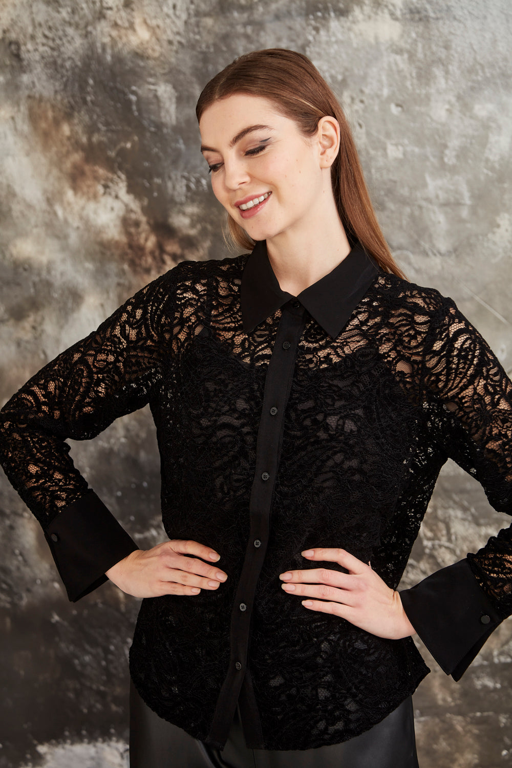 Glide Allegra shirt in textured lace fabric with contrast collar, button placket and cuff. The Allegra shirt buttons through the front. Slim bracelet length sleeve feature a deep cuff fastened with cuff links. The cuff can be worn turned back. Soft curved hemline falls just below the hip. Textured lace fabric. Collar. Bracelet length sleeve. Cuffs have cufflink fastening. Falls below the hip. Separate cami included.