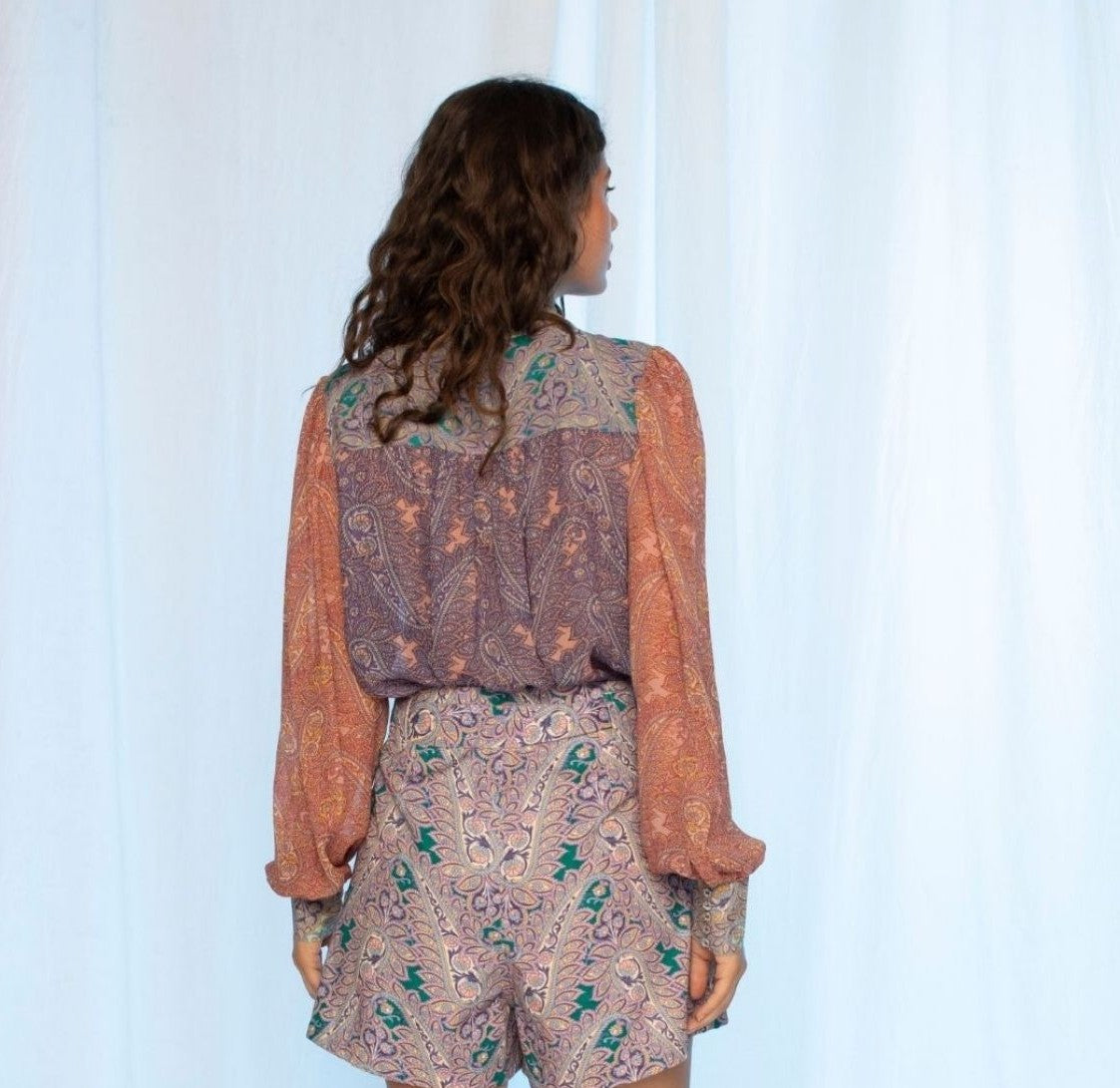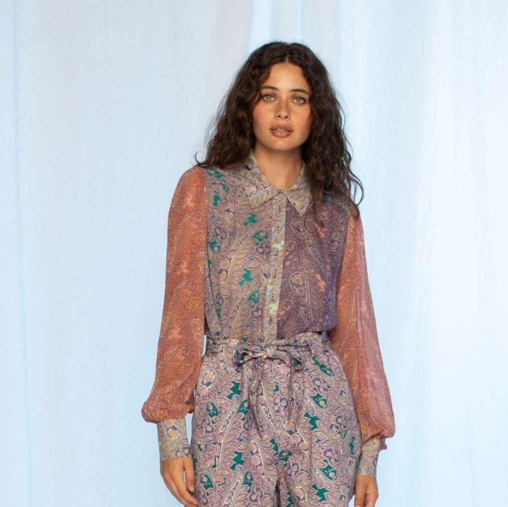 The Lillian Blouse adds a vibrant touch to your wardrobe with its bold, boho-inspired paisley-floral print. This long-sleeve statement piece features a classic collared neckline, button-up front, and cuffed sleeves for a polished yet relaxed vibe.