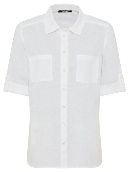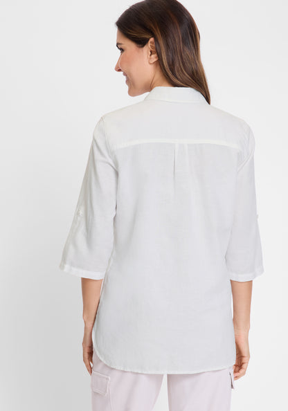 This blouse with a classic shirt collar impresses with its versatile details. The button placket and two breast pockets give it a stylish, functional look. The 1/3 sleeves can be rolled up as desired and secured with a tab and button, giving the blouse a practical and modern touch. Crafted from a pleasant blend of linen and cotton, it ensures a high level of comfort. Length approx. 66 cm.